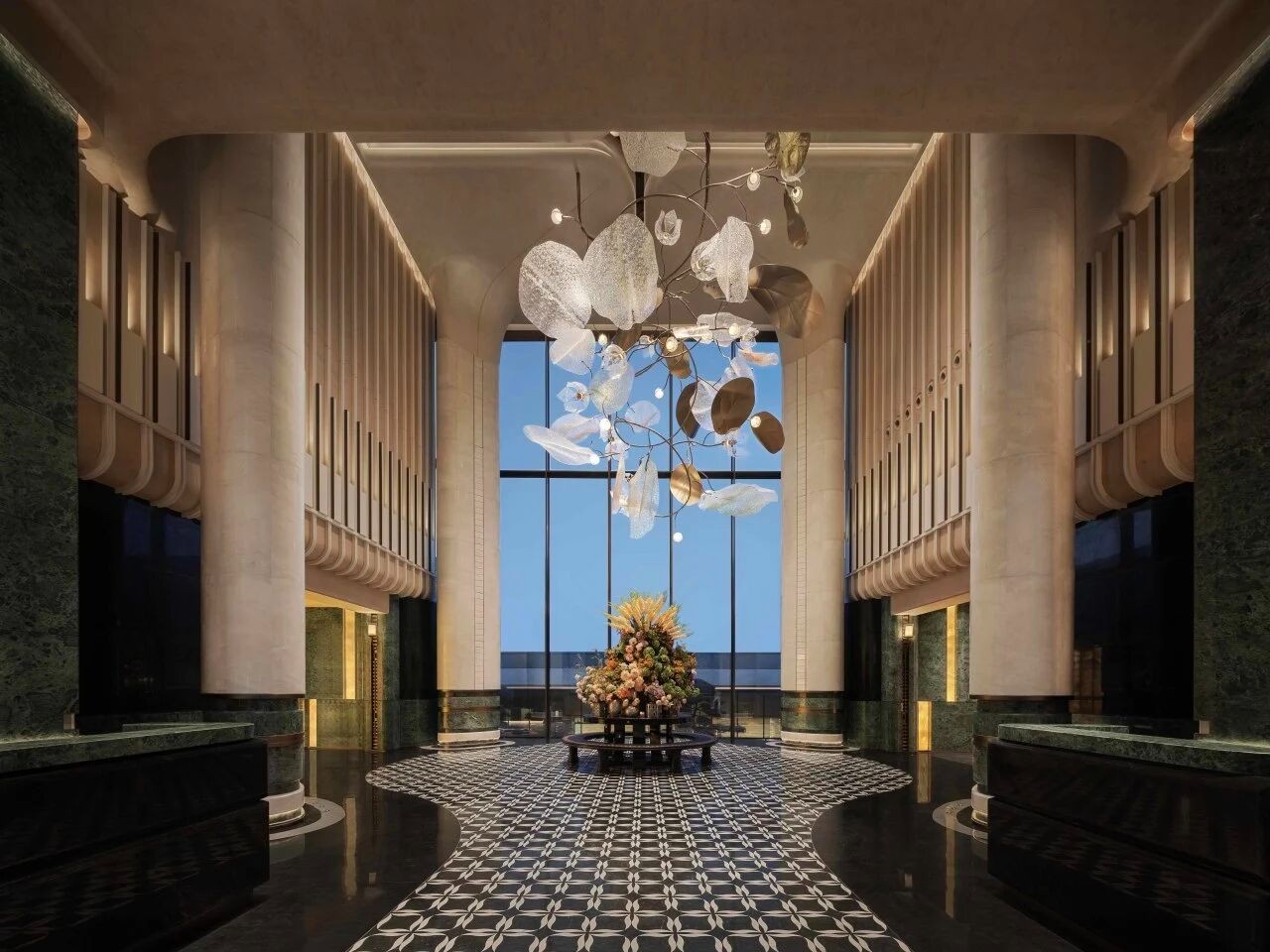 巨大的弧形门窗将庭院景致悉数引入,在天气好时能见到远在嘉陵江对岸的青山。对称而富于变化的设计,也让整个空间兼具松弛与仪式感
