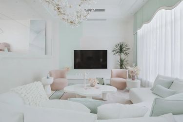 115㎡橘绿灰配色大两居,旋转电视架 大理石岛台,格调拉满!