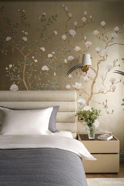 主卧套房中,手绘中式壁纸将卧室与浴室转化为沉浸式的艺术空间。整套公寓展现出静谧的精致私密氛围,历史与现代在此交融,艺术性与个性特质浑然一体,形成和谐统一的整体。
