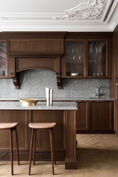 优雅的滑动门连接厨房与客厅,使光线与空气在空间间自然流动。尽管浸润着古典韵味,室内设计却拥抱清新现代的审美,确保永恒品质。