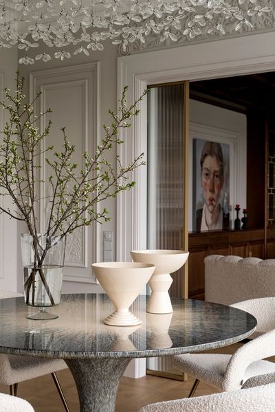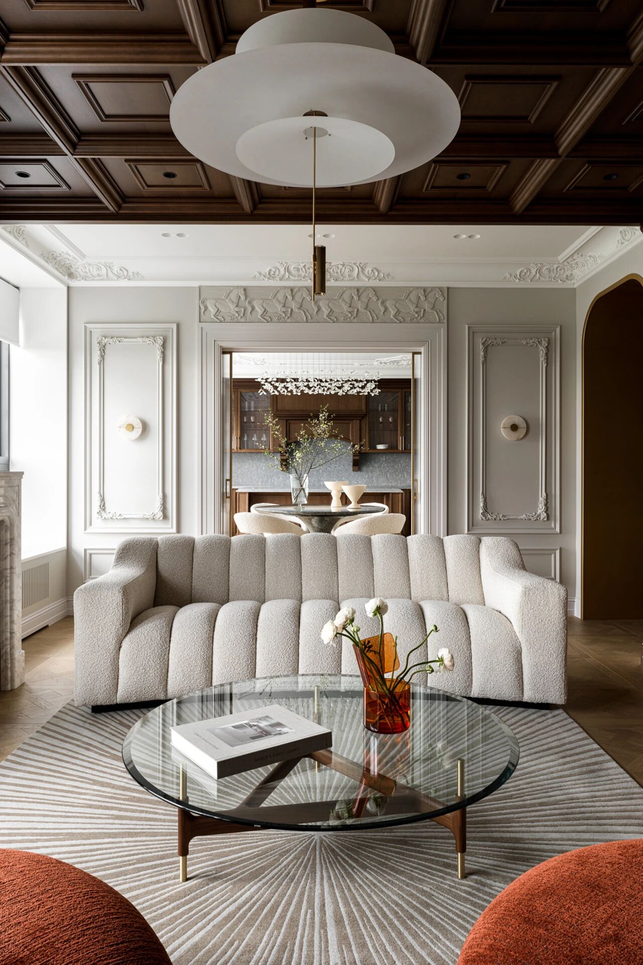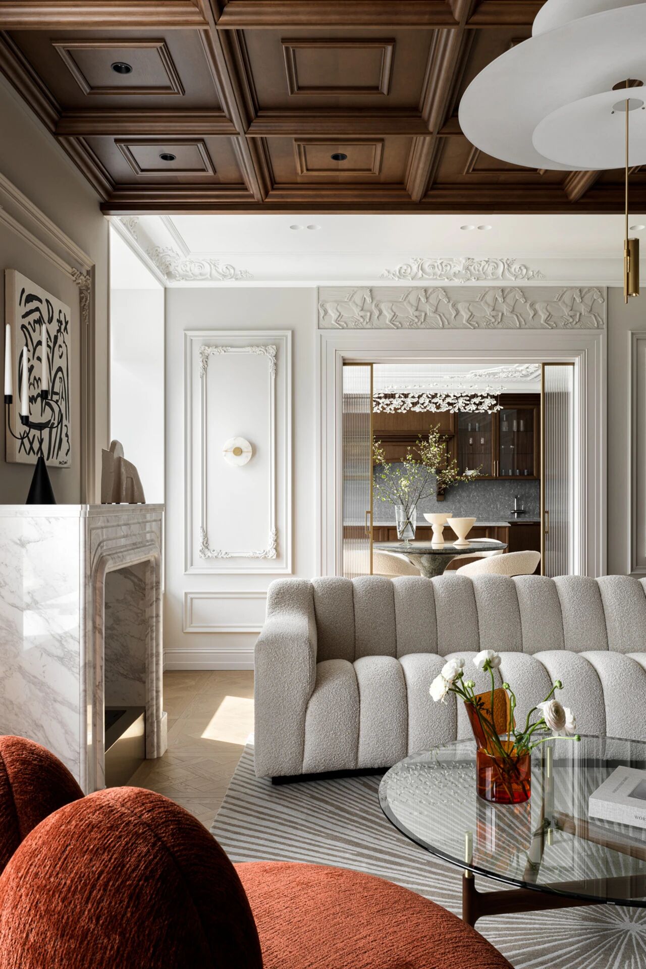 这些景观既是设计灵感,亦构成空间框架,室内设计被构思为窗外景致的延伸。客厅中奔腾骏马的浮雕呼应着附近凯旋门顶端的战车,而格栅天花板、精致线脚与镶木地板则唤起古典优雅的韵味。仿巴黎沙龙的镶木纹理注入了真实而内敛的欧式风情,营造出静谧颂扬优雅与平衡的氛围。