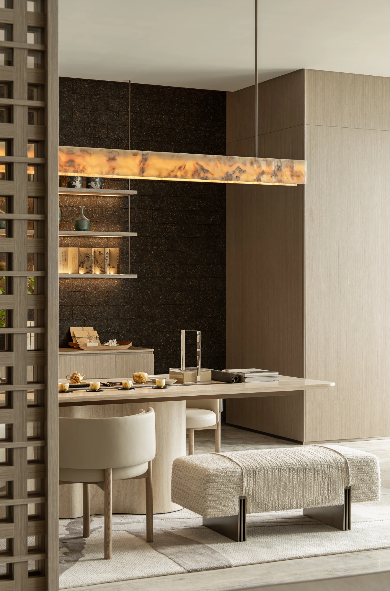 以微妙的光晕勾勒结构的轮廓、润色材质的肌理。灯光透过精工材质,折射出层次的温润,如同诗句中的余韵,不张扬却难以忽视。它让空间的秩序更具呼吸感,也让氛围在静雅与灵动之间找到恰到好处的平衡。