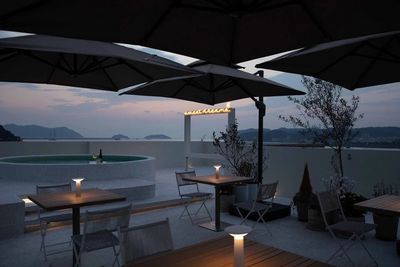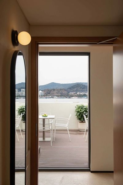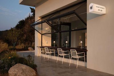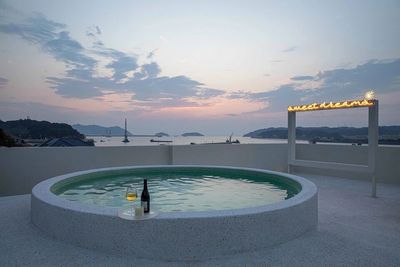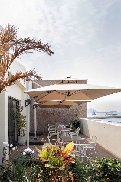建筑顶层空间被一面原始石墙自然分隔,左侧是安静的客房区域;右侧则是一片迎着海风展开的开放式露台。