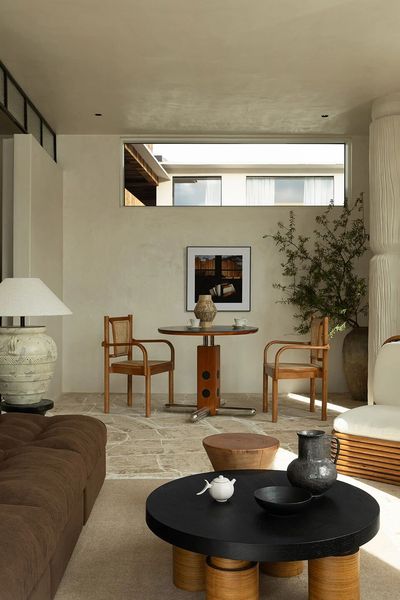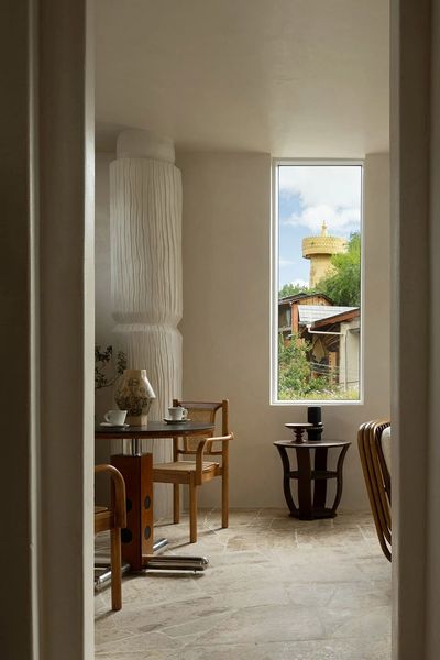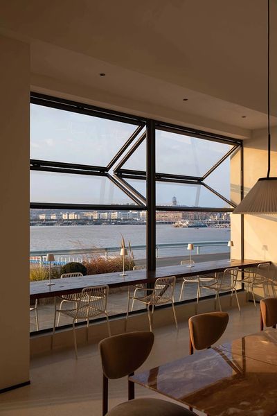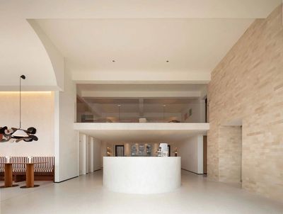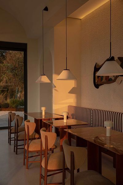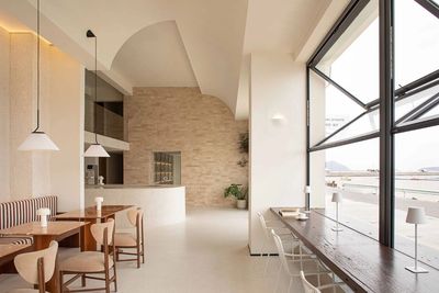 一楼拱形天花的柔光向内倾斜,为空间带来建筑性的包裹感。前厅右侧展开,是面朝海岸的半开放式咖啡餐厅。