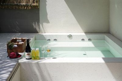 部分房型还有精心设计的小巧思:面朝大海的独立浴缸,一边泡澡一边赏日落;落地灯、小圆几、软椅、香薰、手工卡片,于细节处为旅人准备一场独处浪漫;部分客房设有向海的私享阳台,安放一束光、一把椅,一段属于自己的沉默与海风。