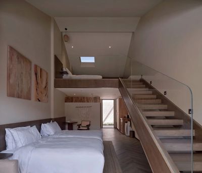 原来7栋房子被大致拆分成南北两区,北侧房屋拥有南向的采光优势,因而线性布局了客房区,包含了九间loft客房和两间套房,loft客房利用原有厂房的高层高,实现了上下都可居的家庭小套房户型,一定程度上缓解了客房数量较少的限制。