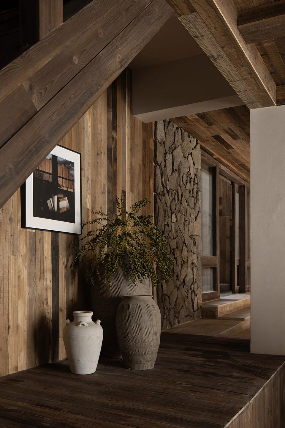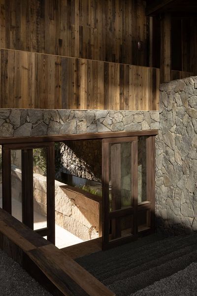 这里是古茶马古道的途径点,大堂是在原有院子里加建的,和半开放的过厅连在一起,结合本地回收的石头,松木板等材料做出了一个歇马饮茶的空间。