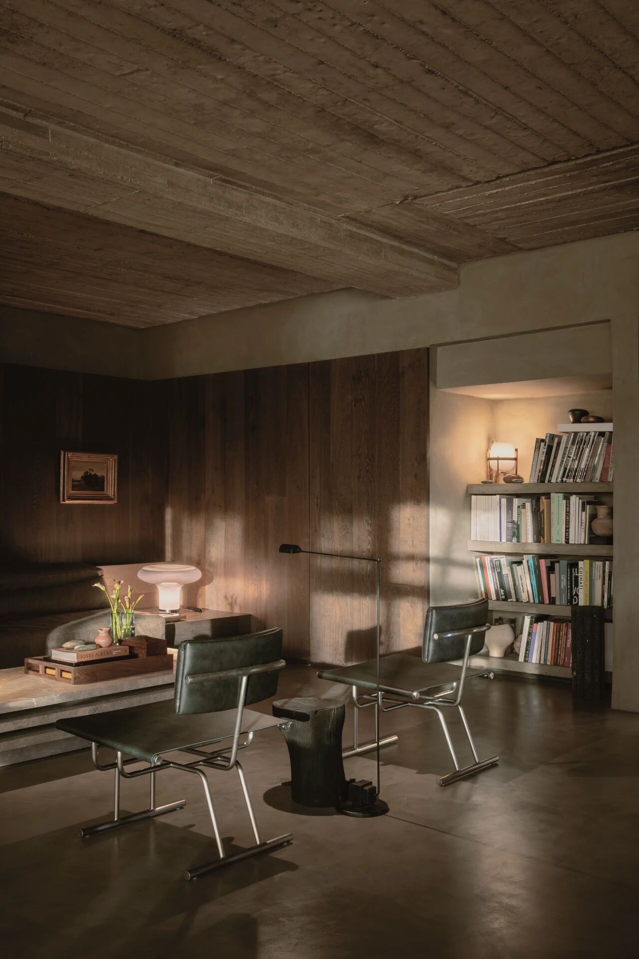 混凝土、深色橡木与不锈钢贯穿空间,营造出一种兼具工业感与温度的氛围。这些坚实的材料被亚麻织物、古旧金属与中性色陶瓷在细节层面所柔化。工作室中的每一件家具与物品都被设计为可以触摸的对象
