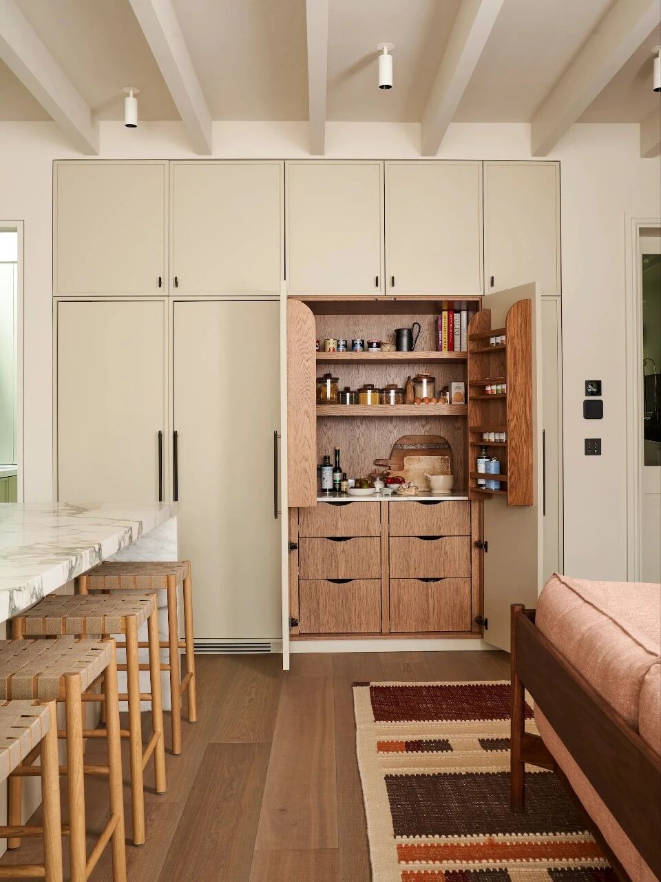 The focus of the project is to reorganize the relationship between structure and space. The design team made the residence more fluid and flexible in function by adjusting the floor layout and usage logic. The rear part of the ground floor was deliberately sunken to achieve a natural connection with the garden and also to create conditions for the expansion of the ground floor. The newly added volume features an open kitchen, dining room and living space. The exposed wooden ceiling beams bring layers and warmth to the space. To enhance the connection with the outside, the design further lowers the rear floor, making the overall height of the interior appear more expansive.