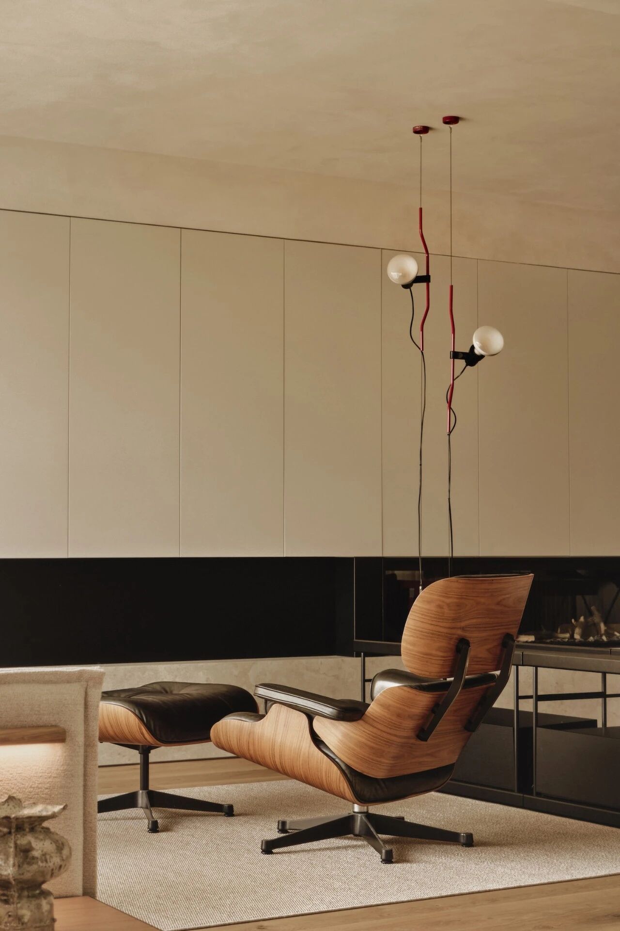 在餐区,Carlo Scarpa 为 Cassina 设计的餐桌以独特的红色饰面带来雕塑般的存在感,成为视觉焦点而不喧宾夺主;Eames Lounge Chair 则以经典的姿态提供舒适体验,呼应项目对超越时尚潮流、追求永恒设计语言的坚持。家具的精心搭配在标志性作品与空间需求之间取得平衡,营造出既典雅又宜居的当代生活氛围。