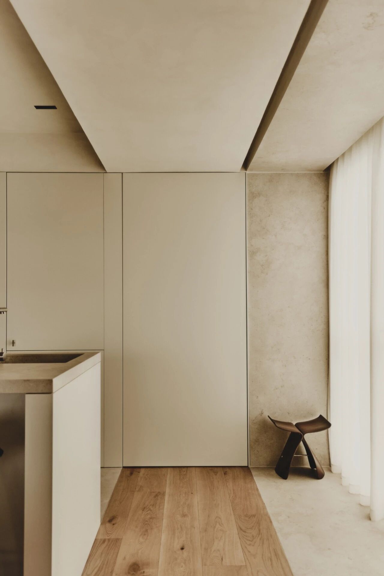 Throughout the residence, French oak flooring establishes a sense of material continuity. Its warm tones and pronounced grain infuse the interior with comfort and intimacy while enabling a smooth visual flow between spaces. The consistent use of flooring enhances spatial legibility, while oak’s natural variations introduce subtle rhythms that interact with shifting daylight, demonstrating how material choices can activate space through the passage of time.