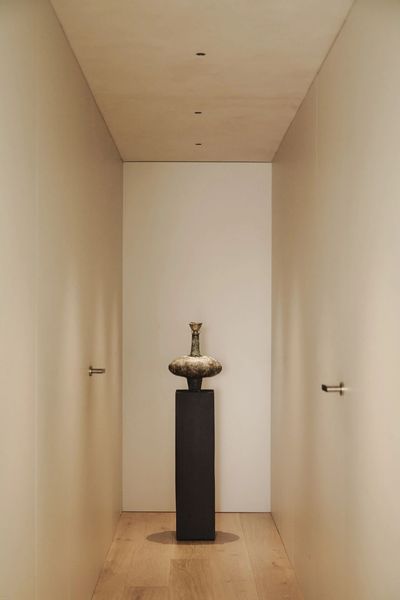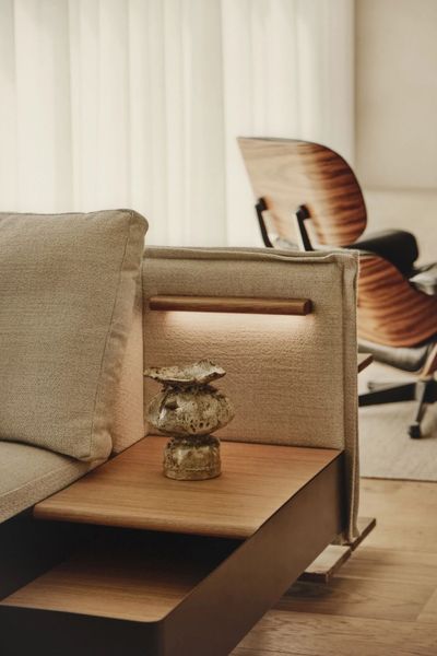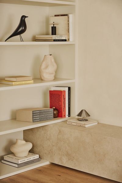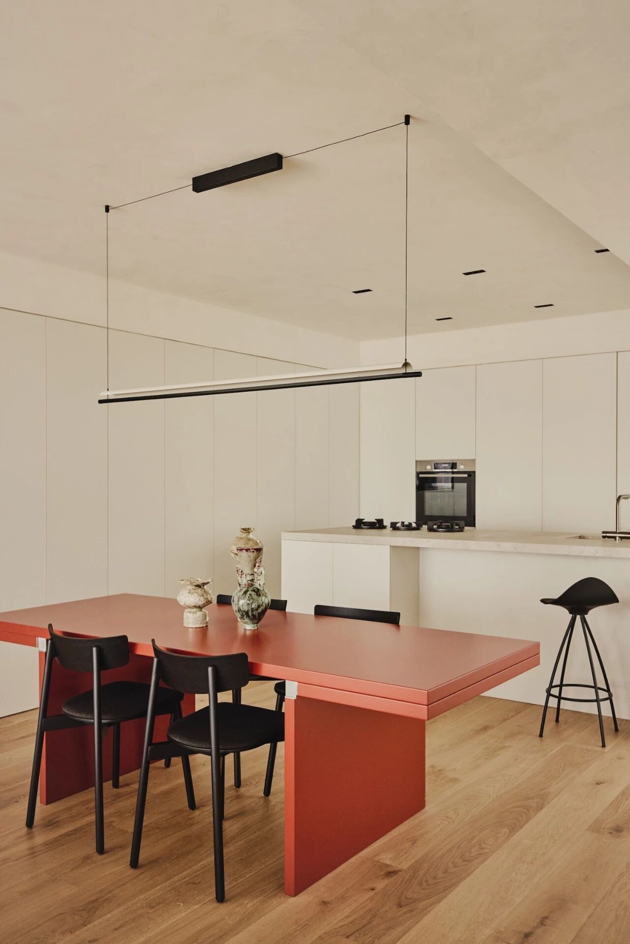 In the dining area, a Carlo Scarpa table for Cassina introduces a sculptural presence through its distinctive red finish—becoming a focal point without overpowering the neutral palette. Meanwhile, the Eames Lounge Chair provides classic comfort, reinforcing the project’s commitment to a timeless design language that transcends fleeting trends. The curated selection of furnishings strikes a balance between iconic design and functional living, resulting in an environment that feels both refined and deeply livable.