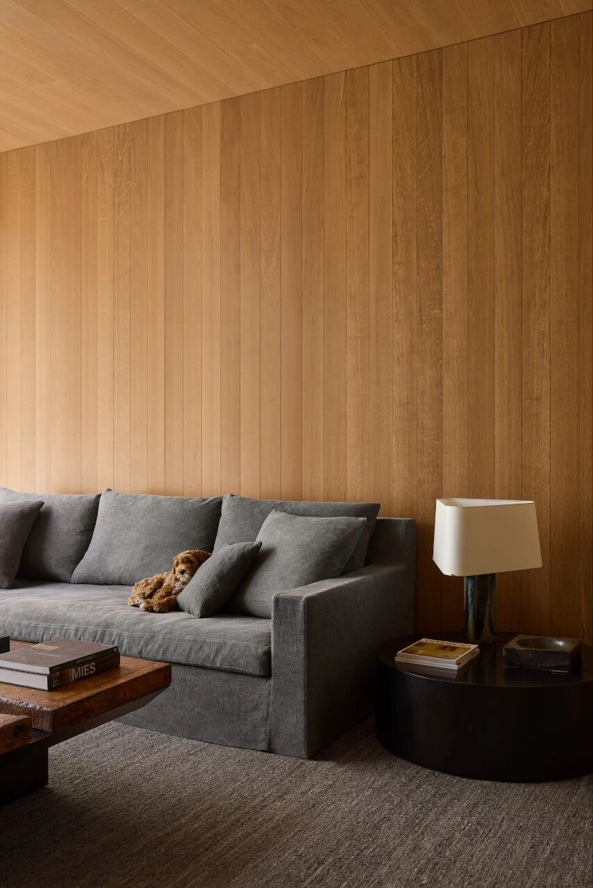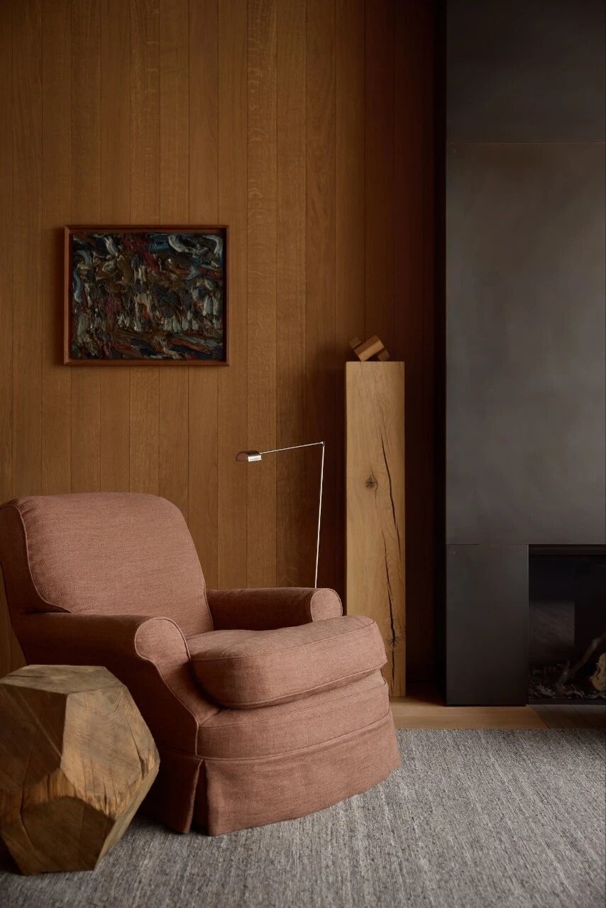 弗克鲁伊塞对“白色作为建筑默认色”的质疑,也折射出他对居住色彩心理学的思考。整座住宅采用较深的色调,源自他对人类更原始栖居偏好的理解——如洞穴般包裹、吸引并安抚居者。这种策略挑战了极简主义常见的冷白语汇,转而以温润、包容的色彩营造出静谧与亲密的氛围。