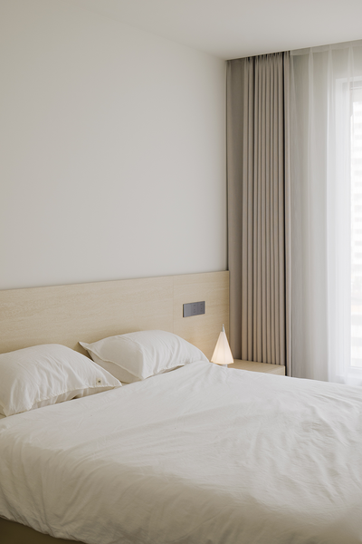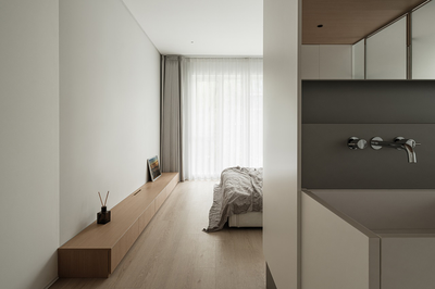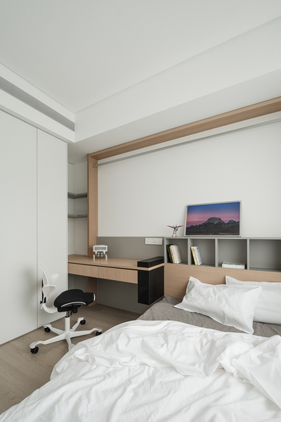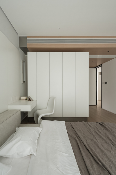 主卧以极简白为基调,运用悬浮柜体营造轻盈通透之感。几何穿插的线条勾勒出立体轮廓,底部与侧畔离缝嵌入柔和光源,光影交织出静谧而治愈的层次韵律。
