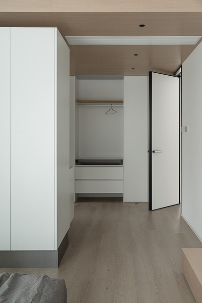 从客厅到卧室的空间动线中,除了延续柜体收纳的规整设计,还特意增设一处开放式挂衣区,让衣物拿取无需翻找,随手可得间更显便捷。