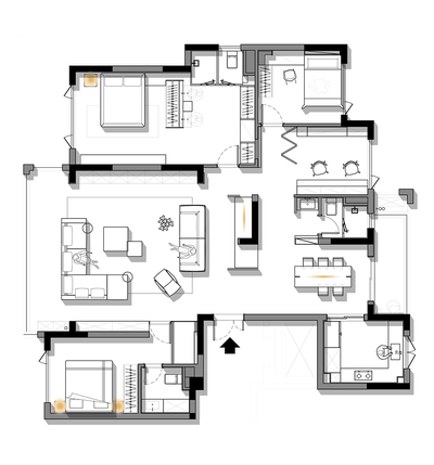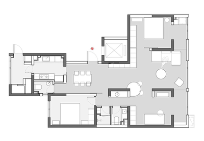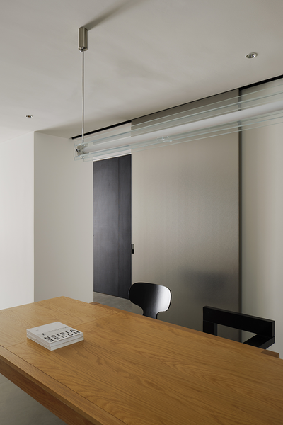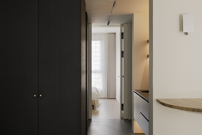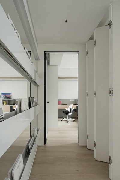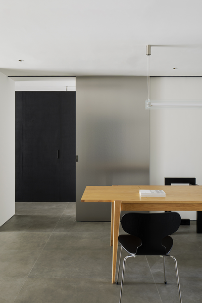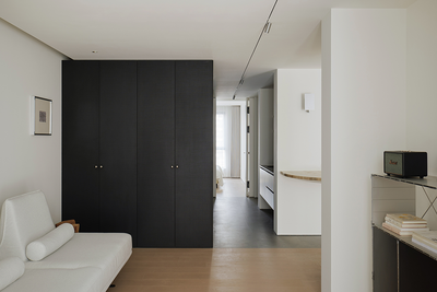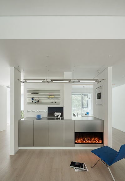 拆除原有墙体,以极简折叠门重构书房边界。过道侧墙巧妙嵌入镜面,通过反射效应无限延展视觉纵深,极大提升了空间的通透感与开阔度。
