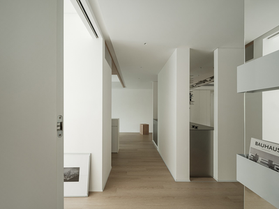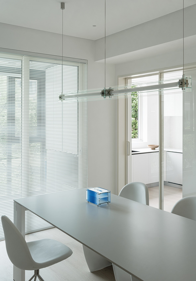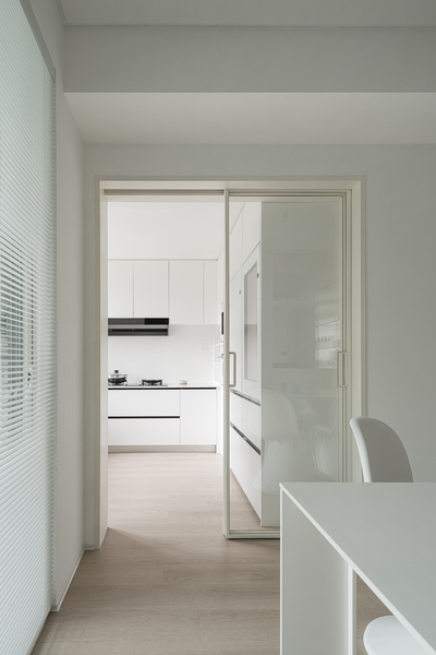 厨房延续整体纯白基调,将原黑色玻璃门替换为通透白色,视觉浑然一体。