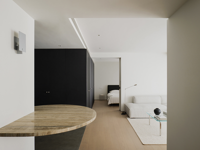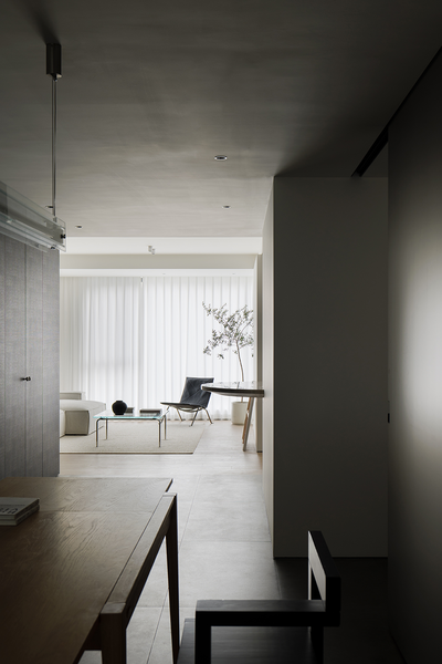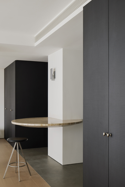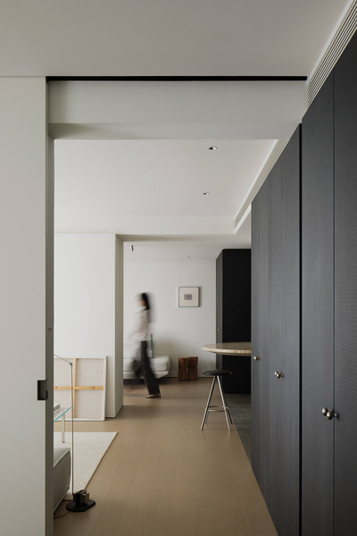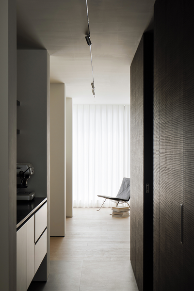 空间以大面积微水泥构筑统一定调,从墙面延伸至天花,形成无缝的“视觉零度”基底。