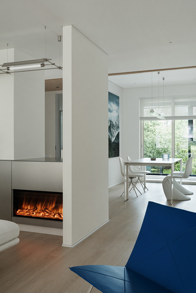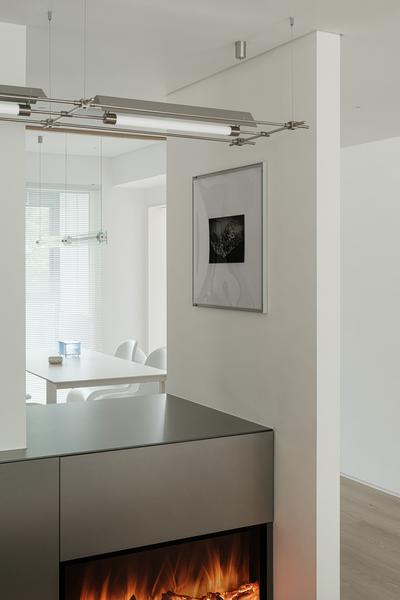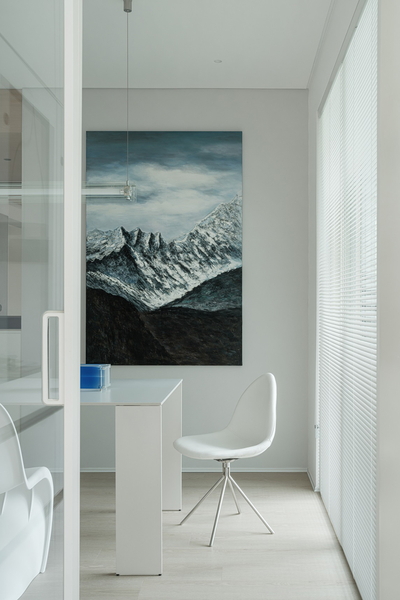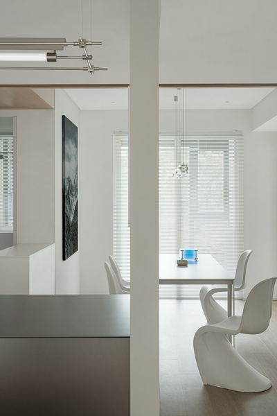 原本采光不足的餐厅,经结构拆改与大面积纯白铺陈,蜕变为通透场域。无过多陈设,仅以屋主拍摄的帕米尔雪山油画作为视觉核心,其逼真肌理与空间底色相互辉映。