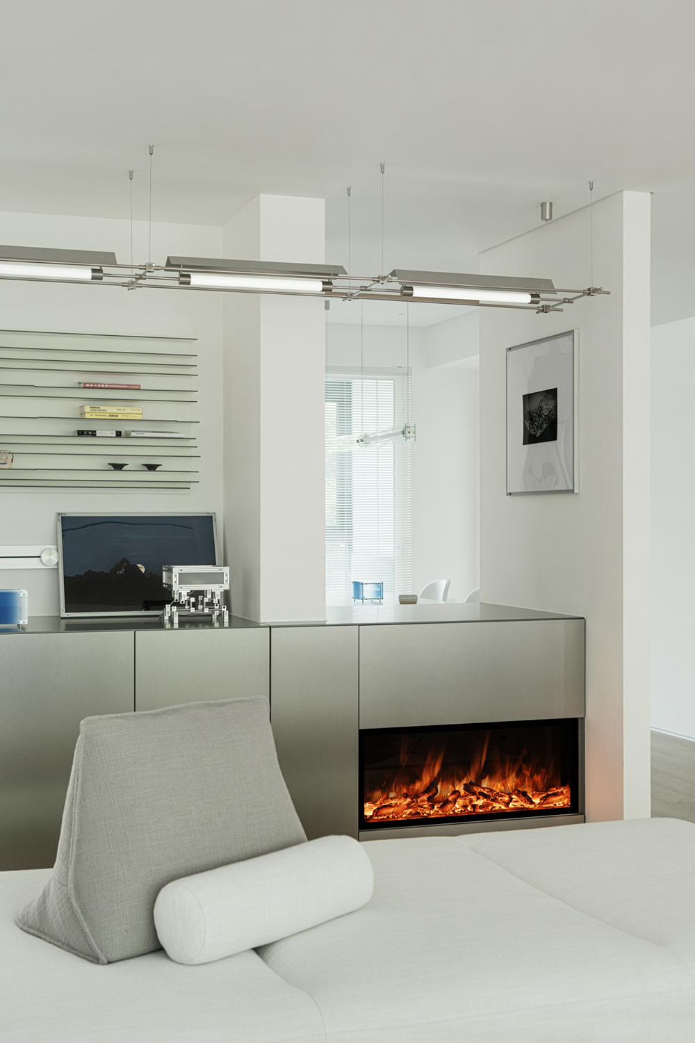 原衣帽间承重墙体被巧妙转化为客厅与餐厅之间的核心枢纽。以金属拉丝材质构筑极简岛台,既补充收纳,更升级为集展示、氛围与社交于一体的立体装置。