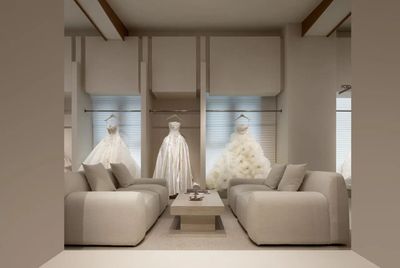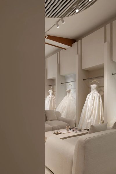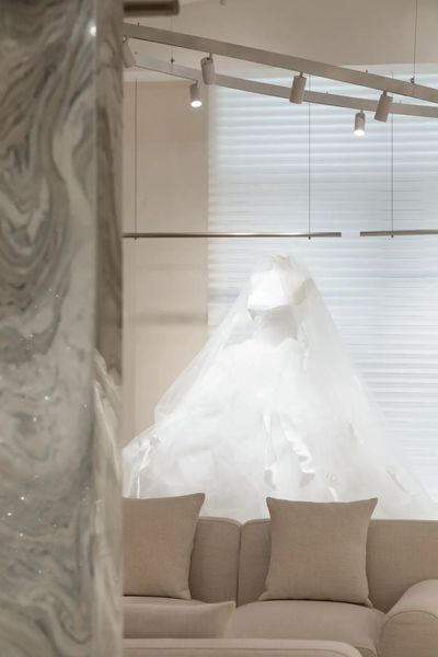 Trying on wedding gowns is the beginning of experiencing happiness. We hope that customers can sense the atmosphere of this space the moment they step in. With warm hues and exquisite fabrics, we enhance the warmth and inclusiveness of the space, showcasing the romance of wedding gowns and pushing the boundaries of spatial aesthetics, while interpreting the inherent sense of value and ritual in a wedding gown gallery.