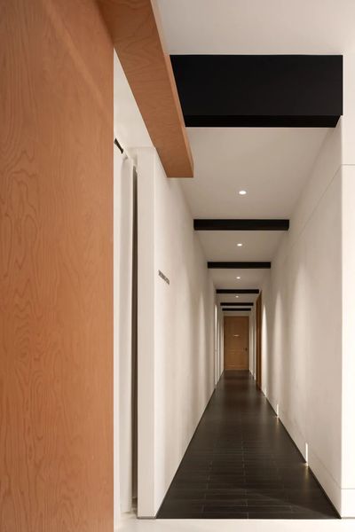 墙体采用了木饰面,其表面天然的纹理,带来一种原始而质朴的美感。休息区与过道之间,设计师巧妙地运用了一堵别具一格的隔断墙,它并非传统意义上的完全隔断,而是以线条解构的手法重新组合,形成了一种独特的几何造型,既保持了空间的连续性,又赋予了空气和光线自由流动的可能。
