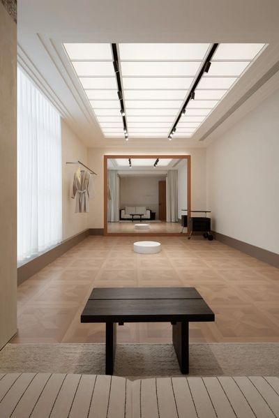 The warm and thick wooden elements blend into the pure white background of the space, softening some of the cold edges and adding a soft and serene atmosphere. It is like the calm and heavy accumulation of time, filled with a sense of comfort, ease, and freedom. The lines converge, the structure is scattered, and the lighting and dresses are scattered among them, restrainedly emanating fashionable rhythm and beauty.