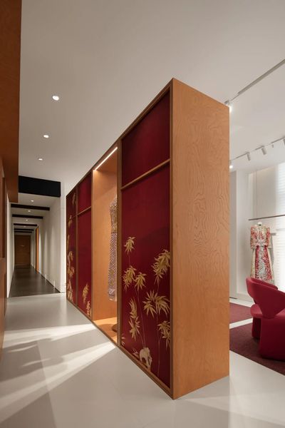 试纱间过道区域,以黑色橡木作为基底,宽旷深邃,静默有力。后方区域往内收合的“抑”,与展示区域向外海纳的“扬”,形成反差,创造了不同情境下的转场体验。开与合的对比,抑与扬的反差,藏与露的统一,创造出静谧与光明的转场。