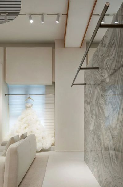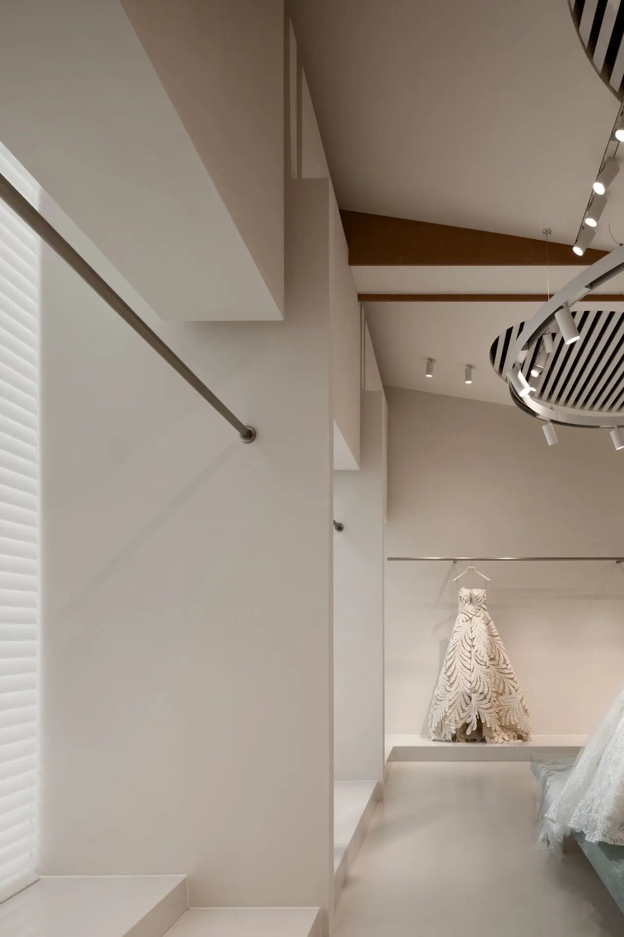 集合店的商品相对多样性,陈列的方式是多样的,空间内大量的留白平面给商品带来更多的陈列可能。为避免过多种类的成列给空间美学带来割裂感,应用尽可能少元素,降低空间对产品的影响,烘托空间的主角。我们必须赋予这个空间的主旋律,无需复杂的结构,无需斑斓色彩,给空间做减法,将主舞台的搭建围绕主角——新娘和礼服。