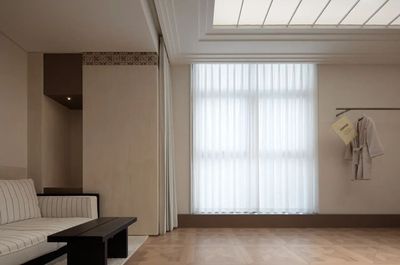 The rich connotation of minimalism implies a high regard for details within a simple appearance. The initial visual perception fully activates other sensory organs, arousing peoples interest in other information such as temperature and texture. The gritty texture of the paint, covering the entire ceiling and window surface, gradually transitions from rough particles to a smooth feel, embodying a silent detachment as well as rigorous and considerate details.