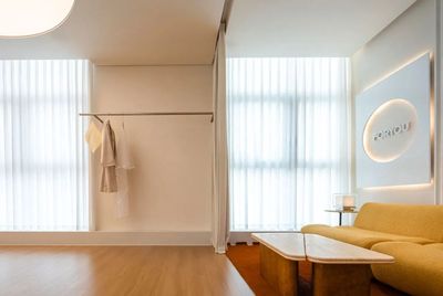 空间中没有刻意为之的色彩搭配,有的只是对于自然的真切回应。选用自然界中的真实材质来铺陈空间。黑白之间,搭配的是暖灰的木质。偶尔出现的跳色也透露着品牌审美的多元化。