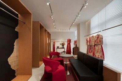 三个主要的功能分区:西式礼服、中式秀禾、化妆试纱,为来访者提供了从西式到中式再到沉浸式试穿的三种不同体验模式。为了不同模式下能更有沉浸氛围,西式礼服区域整体以更温暖的色调来呼应氛围,强调来访者空间体验感受。向前延伸的中式礼服区域则更为沉着、冷静、有序,以产品陈列展示为主要目的。灵活的复合型结构布局的旨意在于让来访者拥有丰富的空间体验。