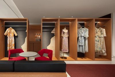 温厚的木质介入纯白的空间底色,少了些许冰冷的棱角,多了一份柔软沉静的氛围,如同岁月沉淀的从容厚重,充盈着那份自在舒适、悠游自若的气息。线条交汇、结构错落,灯饰与礼服散落其间,节制地发散时尚的韵律与美感。