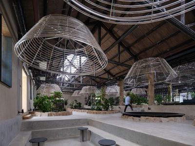 保育其形,活化其神,植入其用,最终导向的是遗址及其所在区域整体的“焕新”。这种焕新是深刻而多维的。矿坑从废墟中重生,成为充满活力、可游可赏可用的文化地标。设计的介入不止于文化层面焕发新意,更将生态修复纳入其中:巨大的圆坑,一部分置入明矾晶体重现结晶池结晶的过程,一部分形成结构脱开的咖啡区卡座,还有一部分则引入室内植物景观,化作涵养水土、孕育微小生态的“自然的容器”。在这种层层递进的更新逻辑中,工业遗址逐渐蜕变为具有生态韧性的基底。