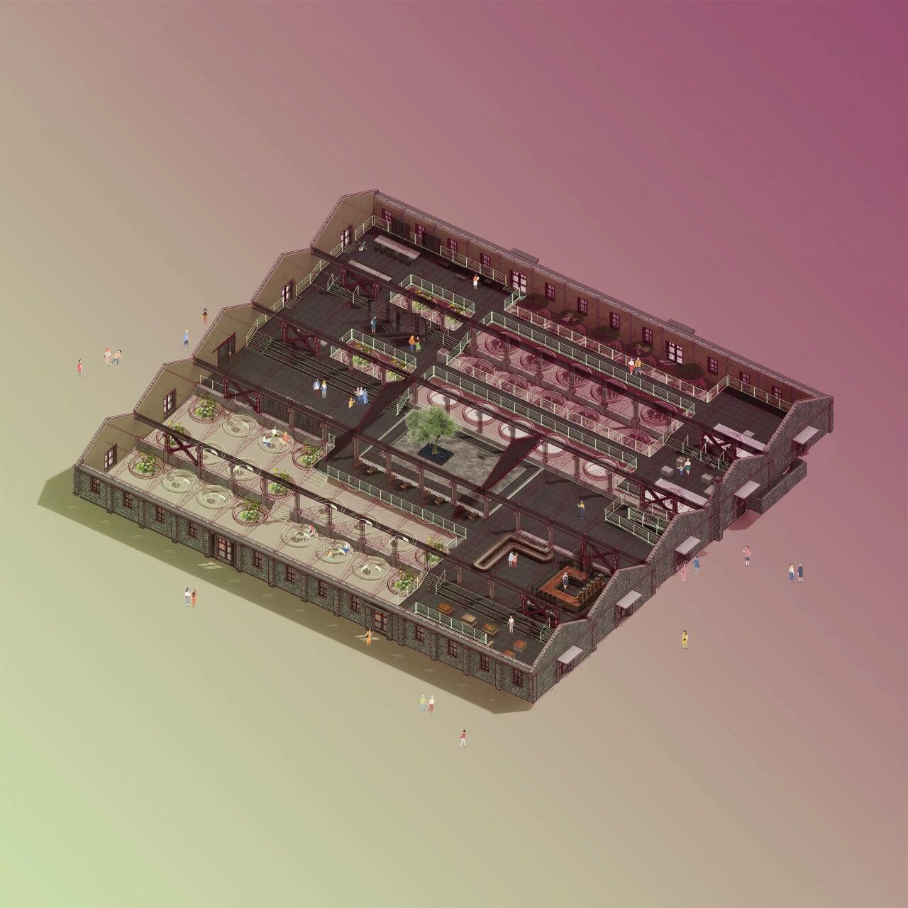 其中最具标志性的植入点莫过于选取尺度适宜的圆坑遗址,将其转化为独一无二的“矿坑咖啡”。顾客沿着栈道下行进入,坐在以晶体为灵感的透光材质的圆环形灯具装置之下,手握一杯温热咖啡,环顾着四周历经沧桑的坑壁,工业历史的厚重与当代生活的闲适在此刻奇妙交融。圆坑从被远观的遗址,变为可沉浸其中、承载当代生活场景的容器,完成了从“客体”到“主体”的身份蜕变。