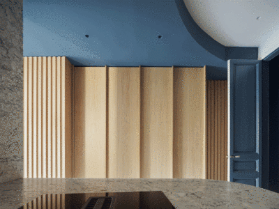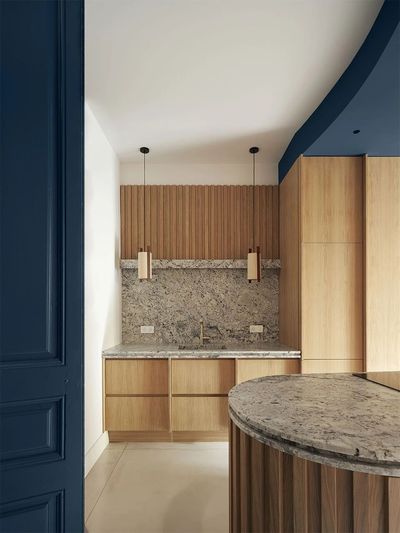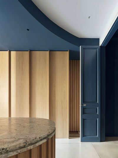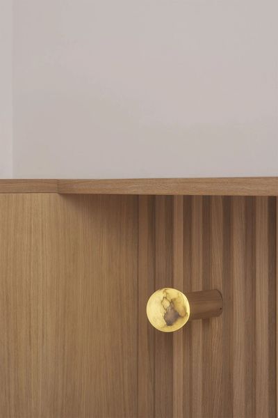 为了优化动线并增加自然光,设计团队缩短了走廊并赋予其新的功能,将其融入整个公寓的布局中。通过拆除四面墙壁,并将厨房置于平面中央,我们得以创造出更宽敞的空间。厨房中的木质墙体与橱柜强化了其作为过渡与功能空间的双重角色。经过这些调整,公寓中面向内侧与外侧的房间都显得更加开阔明亮。