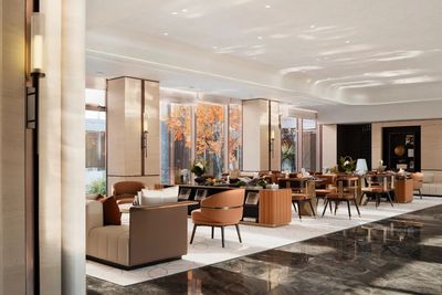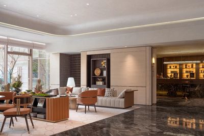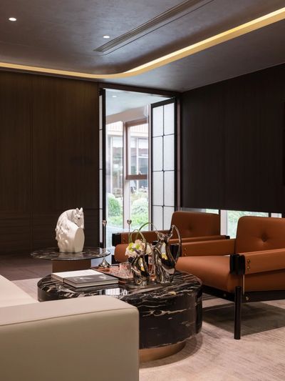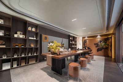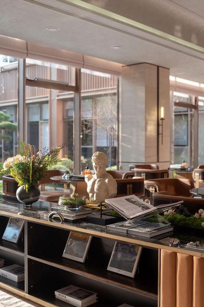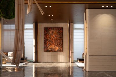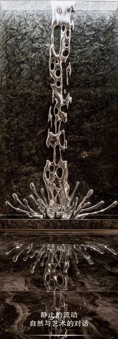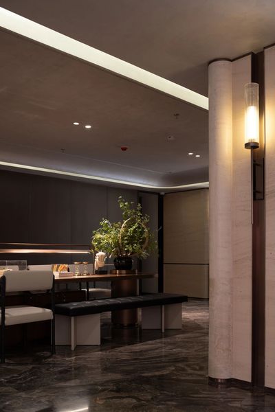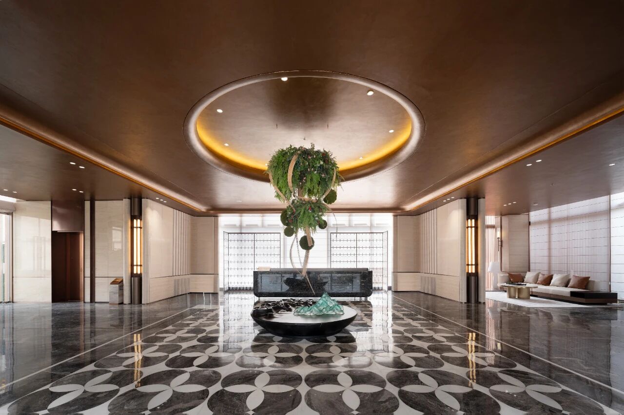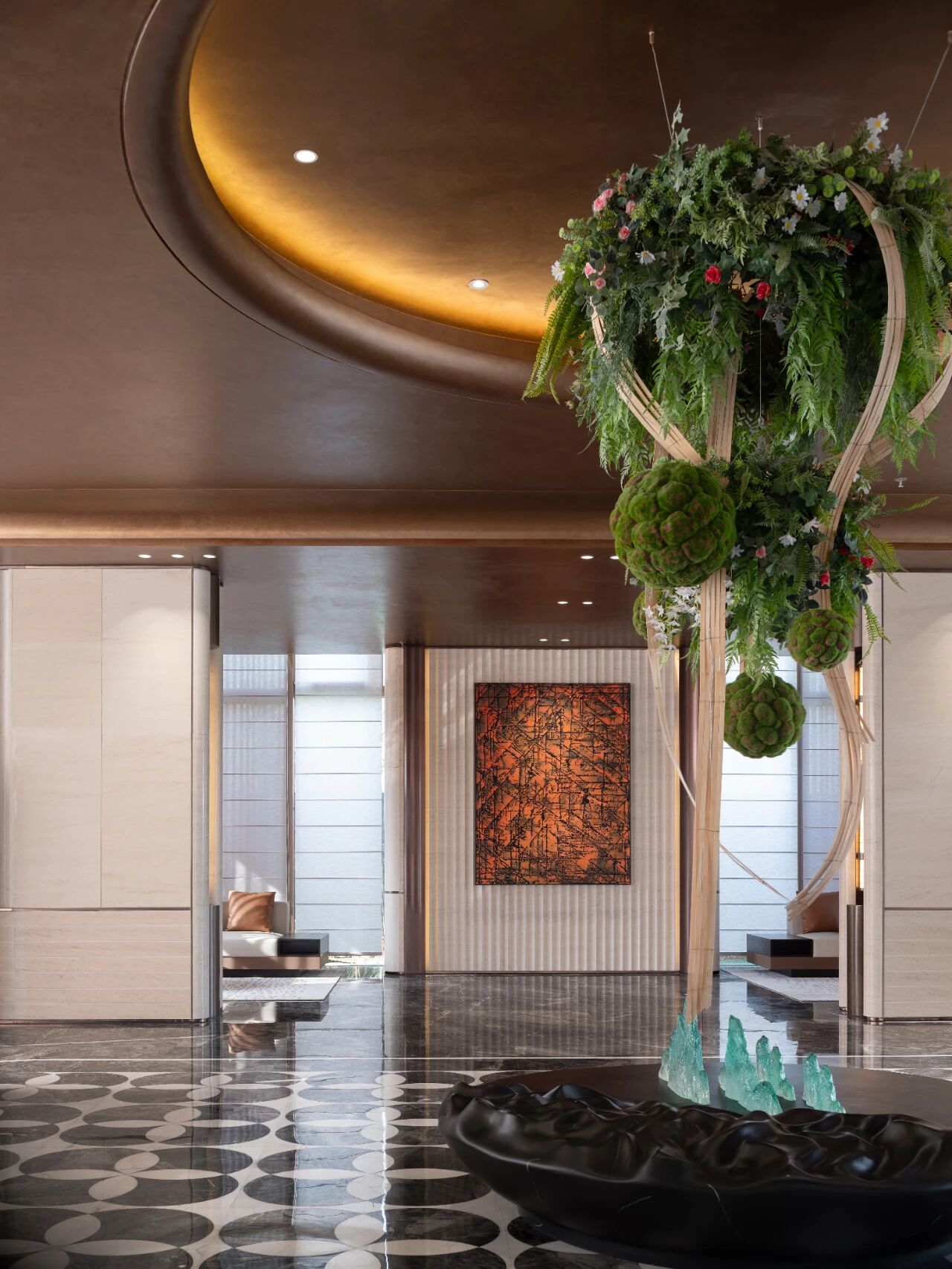 艺术装置与背后通透的艺术隔断呈现出强烈的视觉焦点,接待台采用流线型设计配以温润的石材质感,为空间增添奢华且柔和的触感。大堂中央的艺术陈设以圆形花艺与山水相结合,形成空间的核心氛围,既强化了场域中心感,又自然过渡至不同功能区域。
