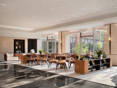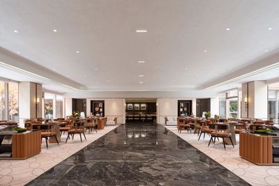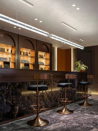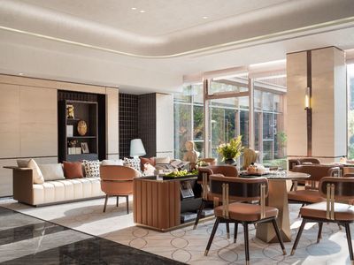 大堂咖啡吧作为会所的主要留客区域,以通透与大气为设计核心,玻璃幕墙将室外的自然光与绿植完美引入室内,模糊空间边界,营造出开放且静谧的氛围。