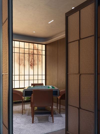 棋牌室以米色肌理漆渲染静雅氛围,竹影摇曳的背景,朦胧静谧的空间氛围,局部运用不锈钢细节,提升空间品质感。 为业主提供休闲交友场所。