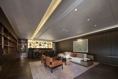 红酒雪茄吧,空间采用名贵奢石、木饰面的材质,温润而高雅,搭以马鞍皮的爱马仕橙的高档沙发,色调稳重而奢华,为业主提供品酒、交友的松弛的交流空间。
