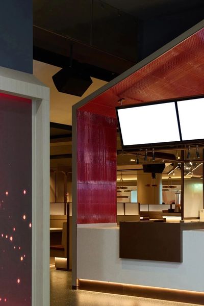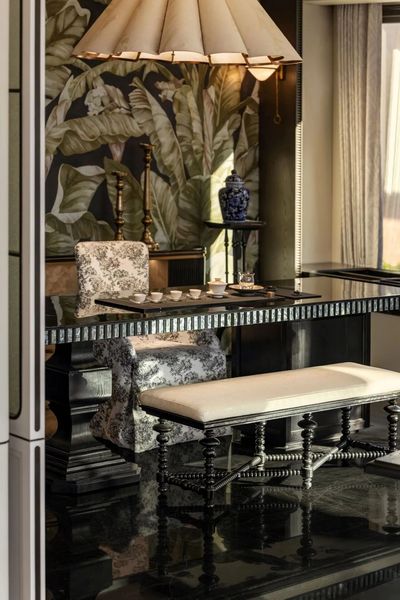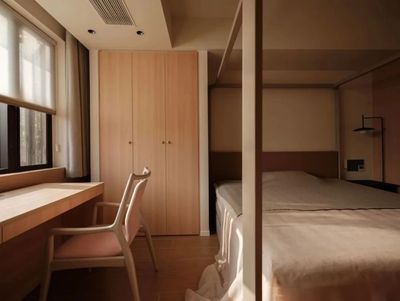 原客厅后方老人房被重新分割,巧妙融入保姆间、半开放茶室与餐厅,增强了区域间的互动与连通。餐茶区域作为家庭核心,承载着日常的情感交流。在此与好友共飨餐食、细品香茗,尽显惬意生活。
