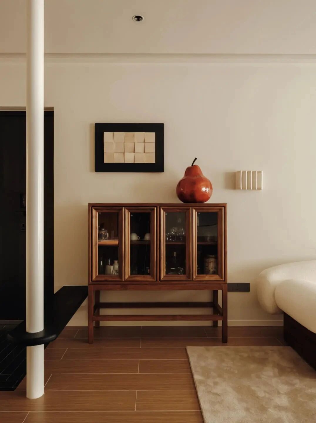 电视墙以简约壁柜勾勒,与木纹地砖相映成趣。立柱雕饰轻缀艺术韵味,空间于实用中流淌诗意。或坐或卧,观影品书,静谧时光亦容纳满室笑语。