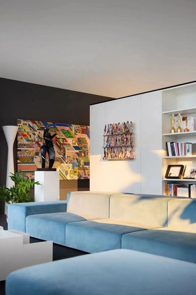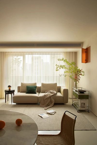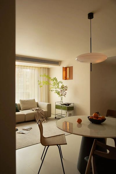 打通原有玄关与储物间,构筑为开阔明亮的开放式客厅。摒弃传统茶几,代以灵活模块化家具,为孩童留白出一方无拘无束的奔跑天地。