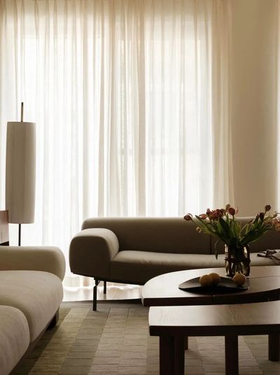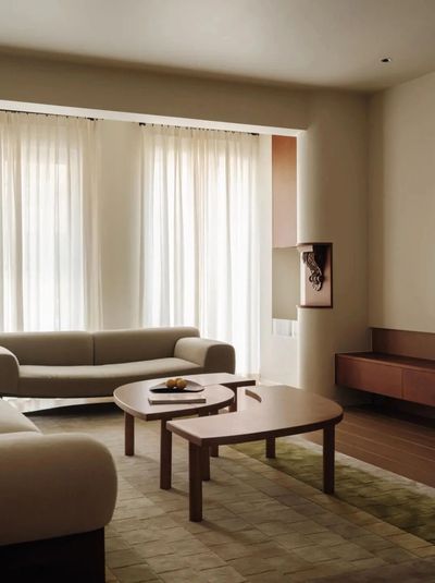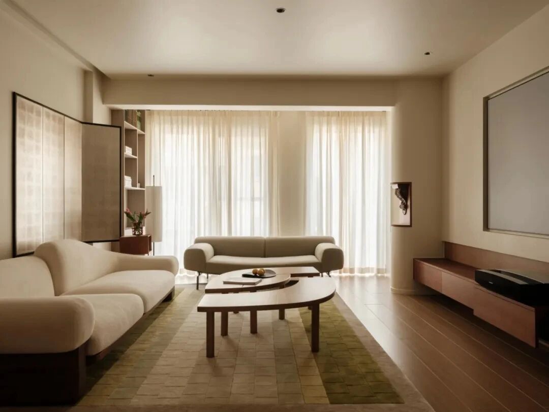 公共区域无遮无挡,视野通透开阔。米色与木色交织出柔和基调,光影漫过纱帘,轻抚银箔屏风与渐变地毯,漾起层层叠影。弧形沙发与茶几,以流畅曲线呼应空间跃动的诗意。