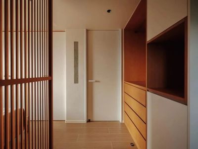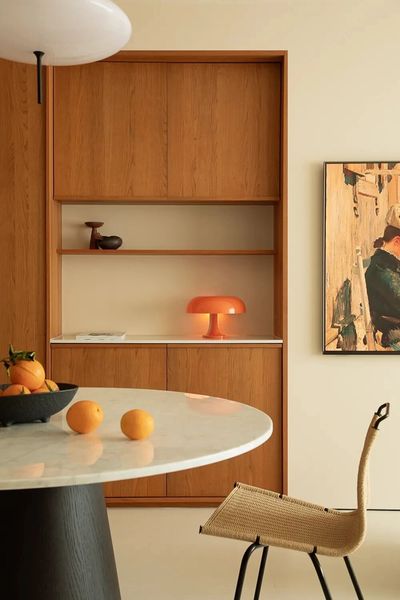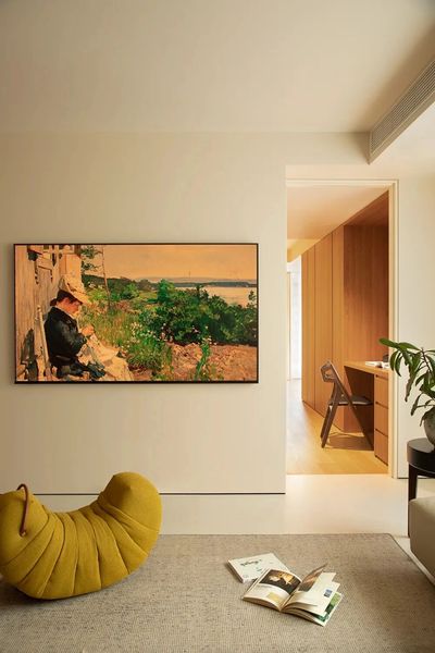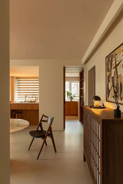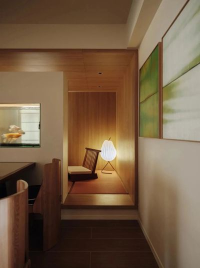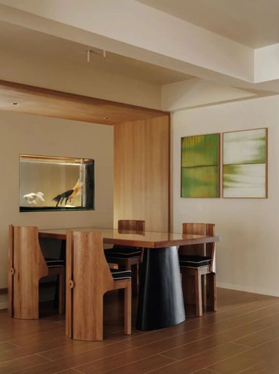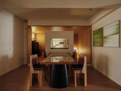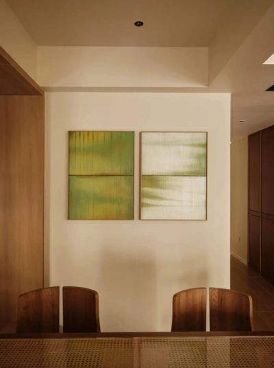 茶室化身为被木饰面与榻榻米包裹的拾光之盒,令人心绪沉静。串联空间的鱼缸漾出灵动涟漪,引人入悠远意境。餐厅墙上的白绿画框,则为此刻添上一抹温润实感。