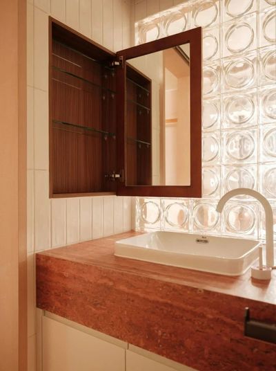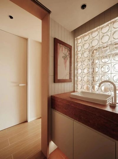 女主卧萦绕东方雅意,国风架子床悬垂纱帘,将窗外绿意漫引入室。卫生间以玻璃砖墙引光,当光线轻抚紫藤花镜柜,藤蔓与花枝仿佛在光影间苏醒,焕发生机。