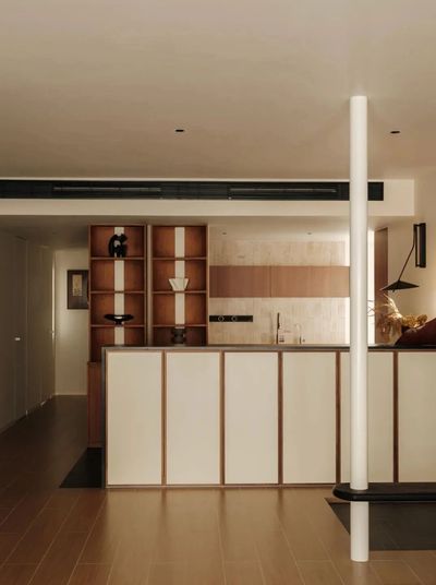 开放式格局消融了厨房与入户的界限。抬高的岛台鞋柜以无把手设计,线条纯净。木质橱柜、仿古砖墙、黑色岩板与火烧石地砖,在温润质感与实用功能间达成诗意共鸣。