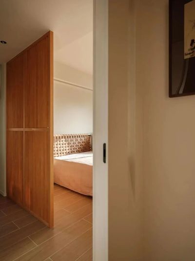 男主人卧室浸润于柚木的温润质感。木质格栅如时光琴弦,编织出诗意忘我之境。包豪斯风格的复古真皮编织床,以独特粗犷的个性,演绎方中有圆、刚柔并济的生活哲学。