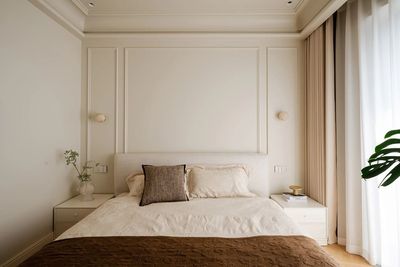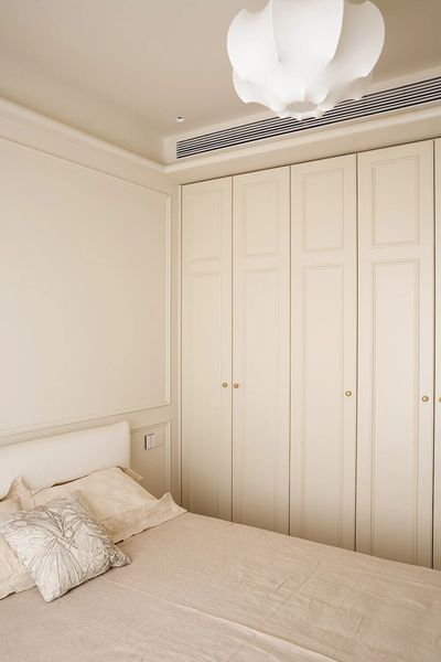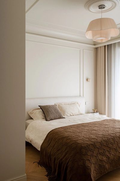 卧室区域:延续全屋奶油系主调,墙面以奶油白乳胶漆结合精致石膏线造型,与公共区域设计形成呼应,强化风格统一性。床品选用米白肌理面料搭配棕色纹理抱枕,棉麻质感传递自然温柔的触感;两侧白色床头柜简洁实用,搭配球形壁灯与绿植花艺,在柔和光影与自然生机的交织中,营造出法式卧室特有的静谧疗愈氛围。