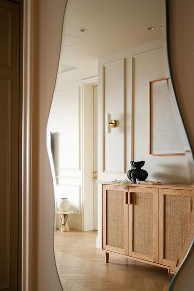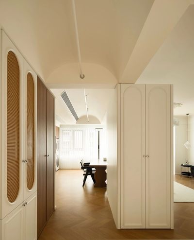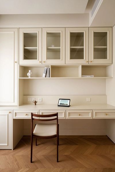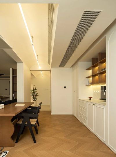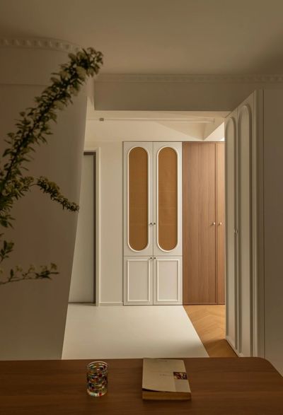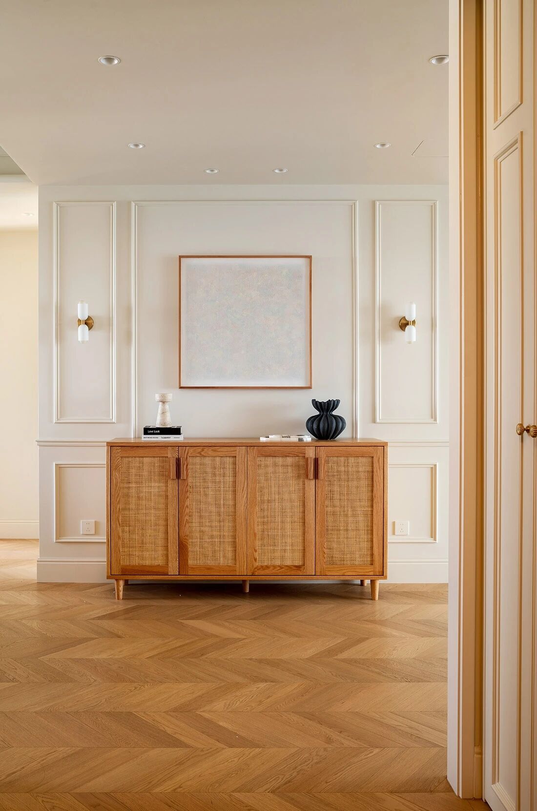 餐厅延续客厅奶油系主色调与木色基因,定制带法式线条的餐边柜,藤编门板设计与客厅边柜形成呼应,强化风格统一感;餐桌椅选用棉麻与实木结合的款式,传递自然质朴的法式情调。